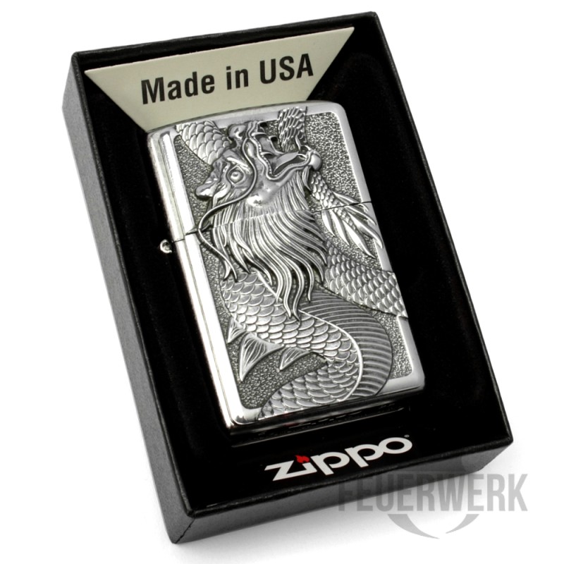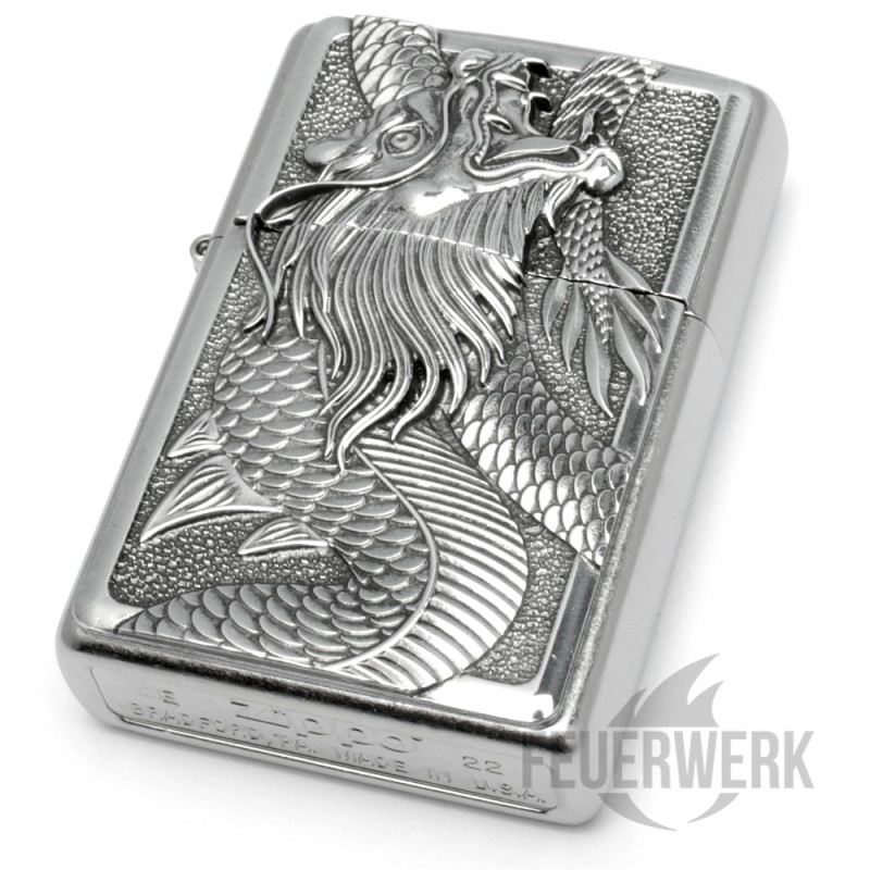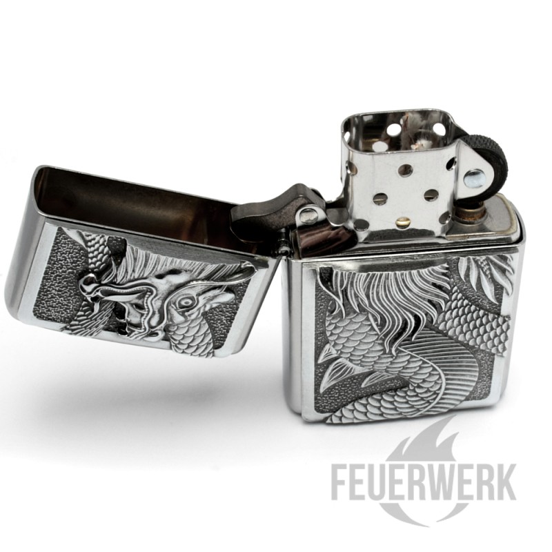 Detaillierter Drache auf Sturmfeuerzeug Zippo Feuerzeug mit Glückbringer Motiv
