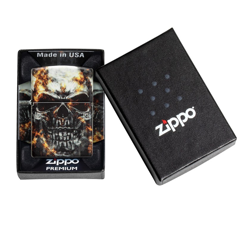 Echtes premium Zippo, mit dem unverwechselbaren Zippo "Klick", kommt dieses windfeste Feuerzeug in einer originalen Geschenkbox verpackt. Das Feuerzeug mit heißem Totenkopf-Motiv besteht aus rostfreiem Metall und funktioniert praktisch überall. Das Feuerzeug wurde in den USA hergestellt und kann jederzeit mit Feuerzeugbenzin nachgefüllt werden, für einen lebenslangen und nachhaltigen Gebrauch.