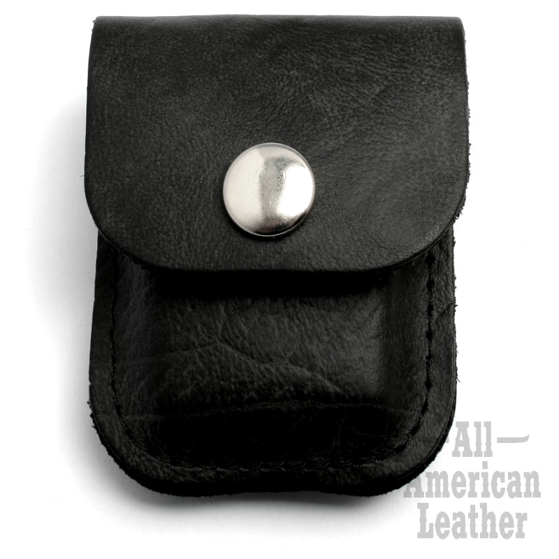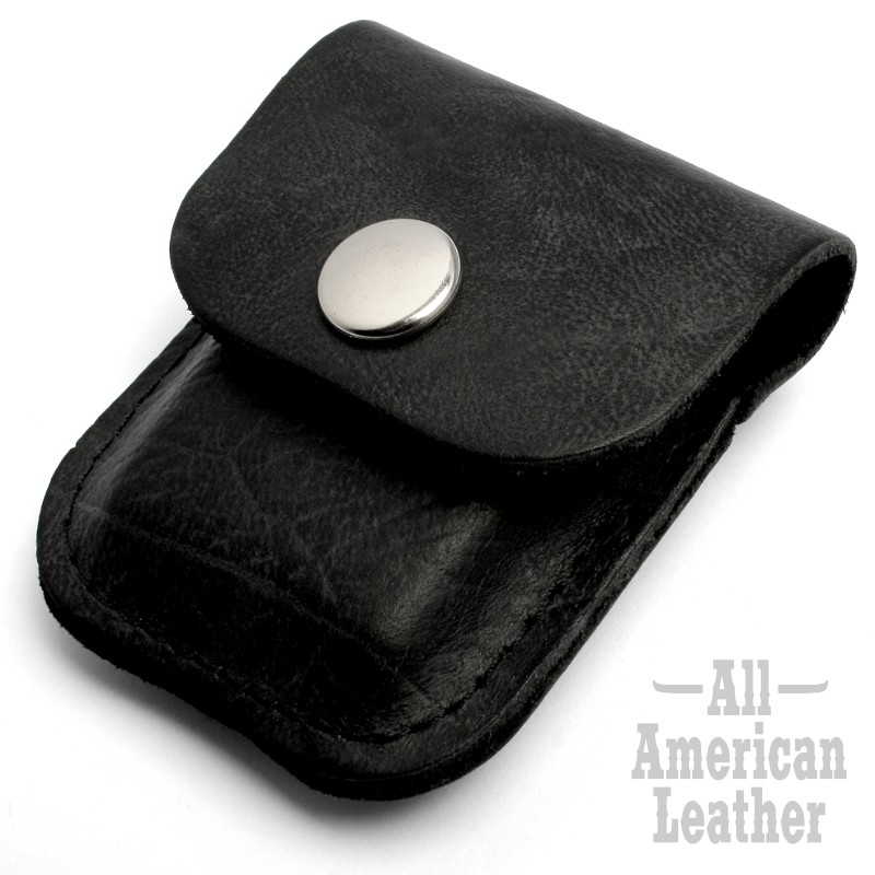 Hochwertige Feuerzeugtasche aus echtem Leder mit Gürtelschlaufe, passend für klassische Benzinfeuerzeuge. Zeitlos in Schwarz gehalten, mit silbernem Druckknopf. Das Leder ist dick und robust und die Verarbeitung insgesamt sehr wertig - Made in the USA.