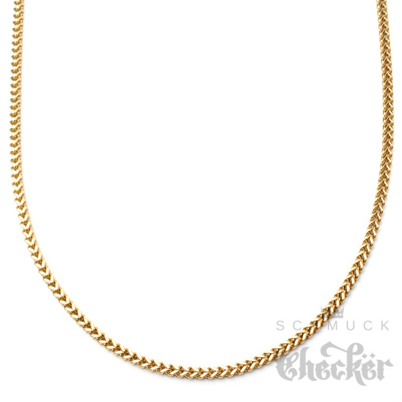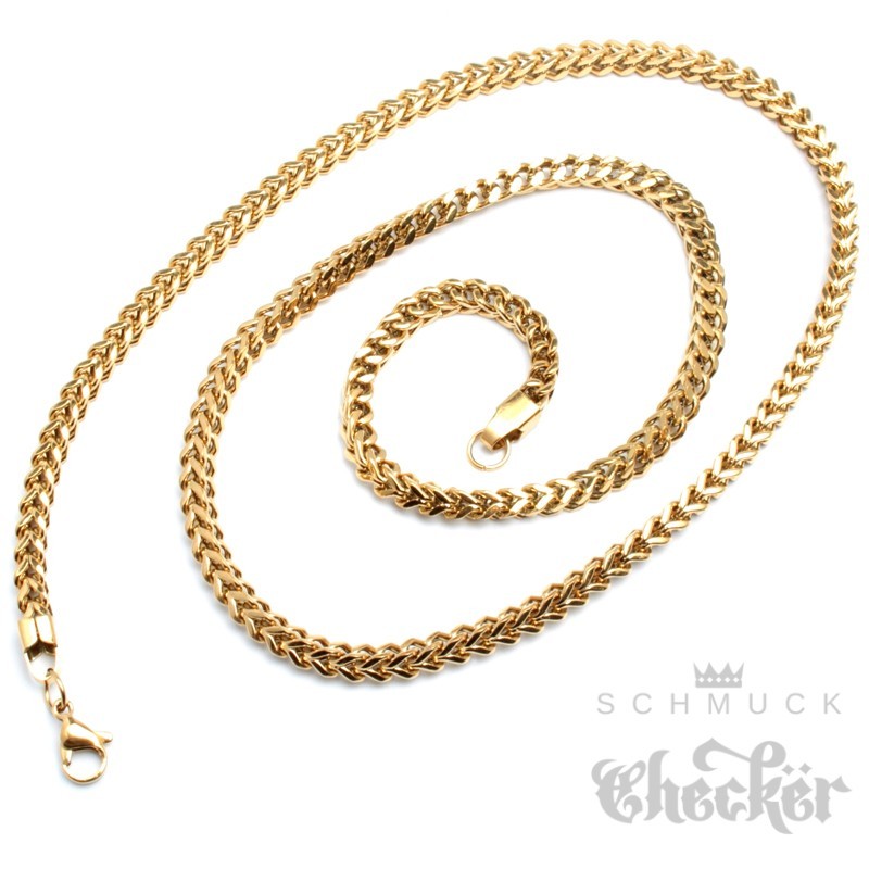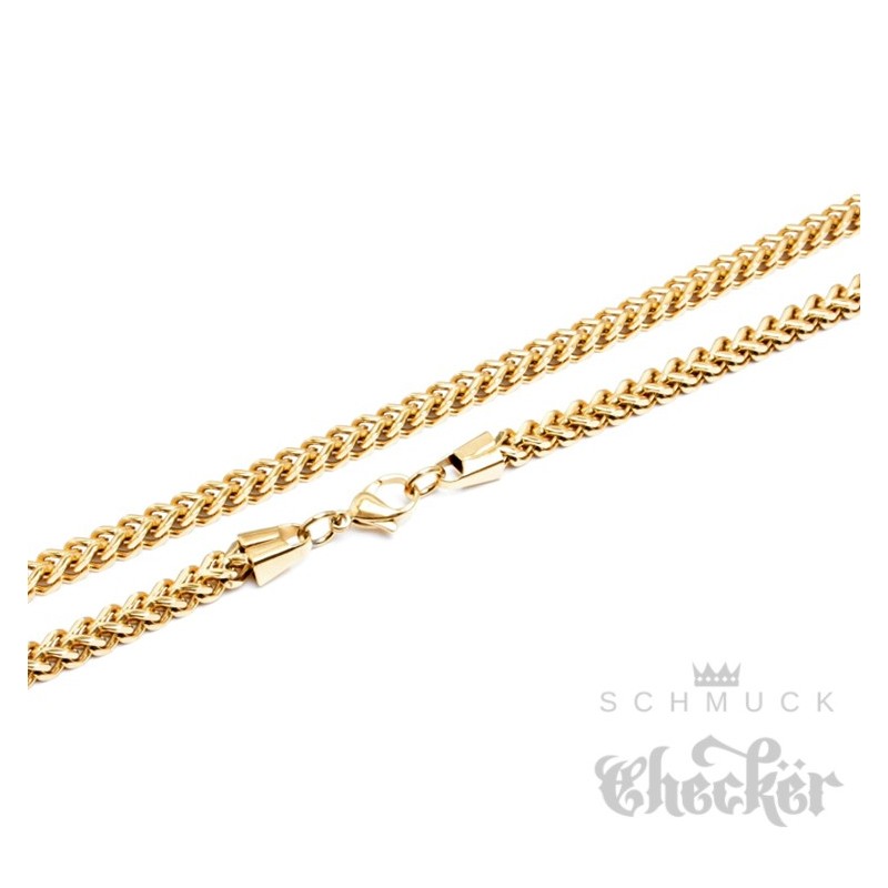 Goldene Halskette für Herren aus hochwertigem Edelstahl hier kaufen. Die Halskette ist 60cm lang, in verschiedenen Dicken verfügbar und besteht aus zwei aneinander geschweißten Panzerketten. Daraus entsteht ein ganz eigenes und besonderes Aussehen. Die Halskette passt nahezu zu jedem Style und kann gut in Kombination mit Kettenanhängern getragen werden.