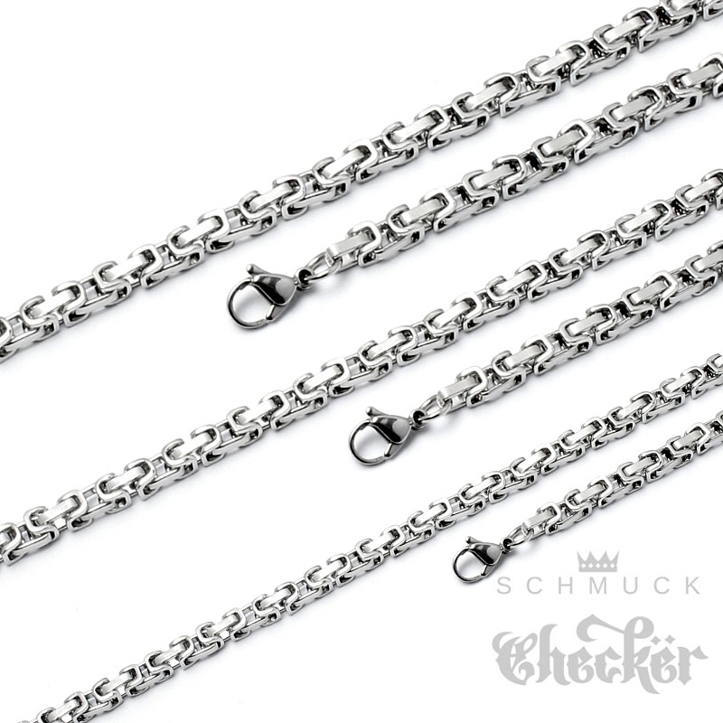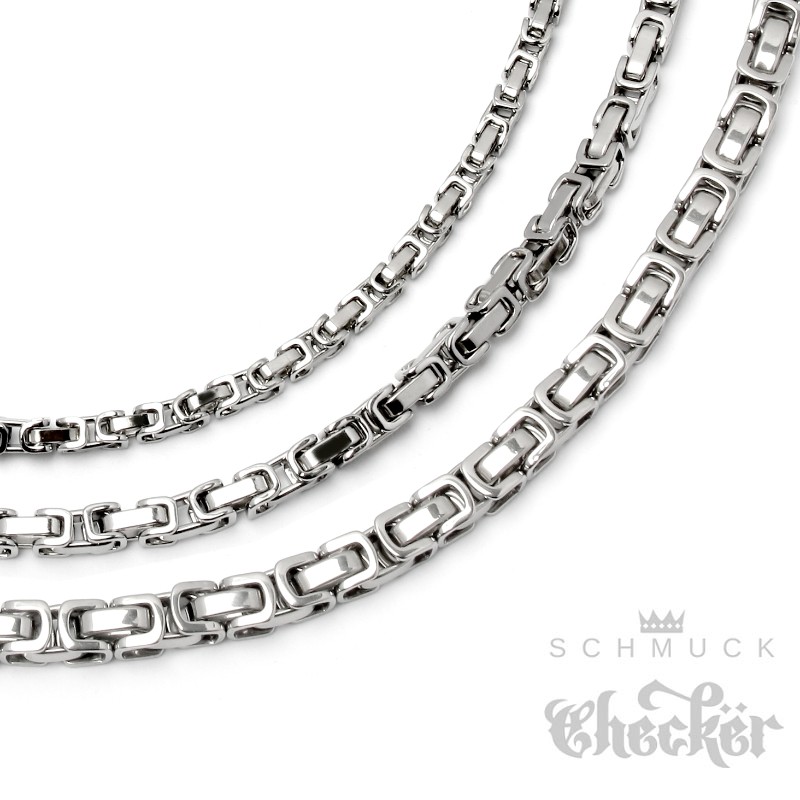 Robuste Königskette für Herren aus hochwertigem Edelstahl gibt’s hier in unterschiedlichen Stärken/Dicken zu kaufen. Mit der dünnsten Variante habt ihr endlich mal eine Königskette, die etwas dezenter und trotzdem maskulin ist. Sie kann auch gut in Kombination mit Kettenanhängern getragen werden. Die dickste Variante ist recht massiv und entsprechend auffällig. Sie kommt am besten zur Geltung, wenn auch der Hals, an dem sie getragen wird, etwas muskulöser ist. Die mittlere Variante ist ein super Allrounder und kann von fest jedermann und zu jeder Gelegenheit getragen werden. Die Königsketten sind alle silberfarben mit polierter Oberfläche und haben eine Länge von 60cm. Problemlos können die Halsketten gekürzt werden und es gibt auch Möglichkeiten sie zu verlängern. Dazu mehr in den Hinweisen.