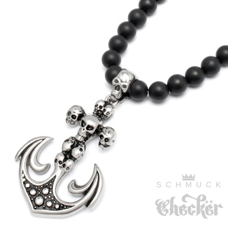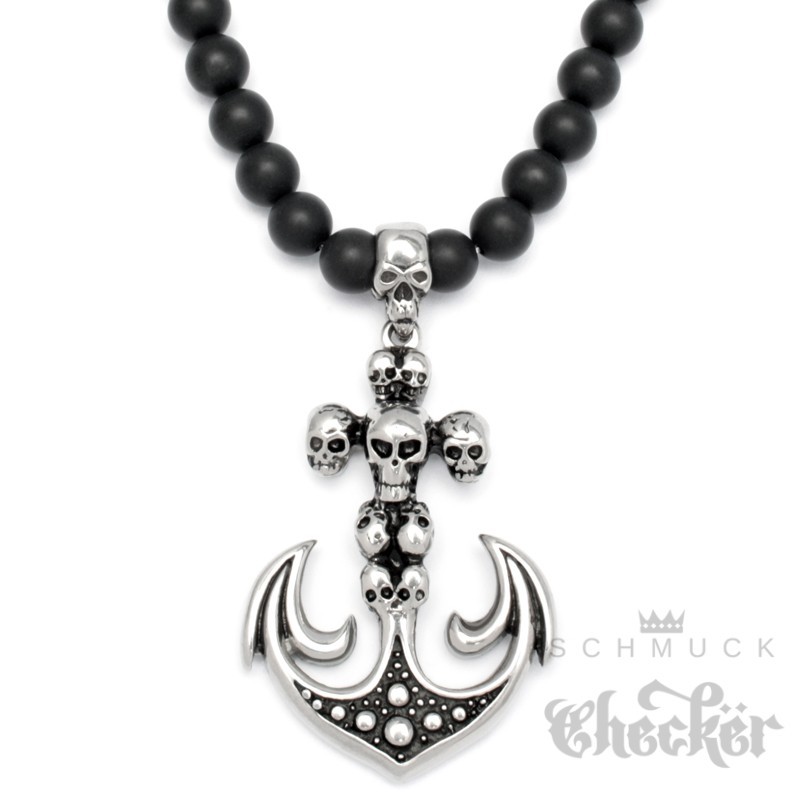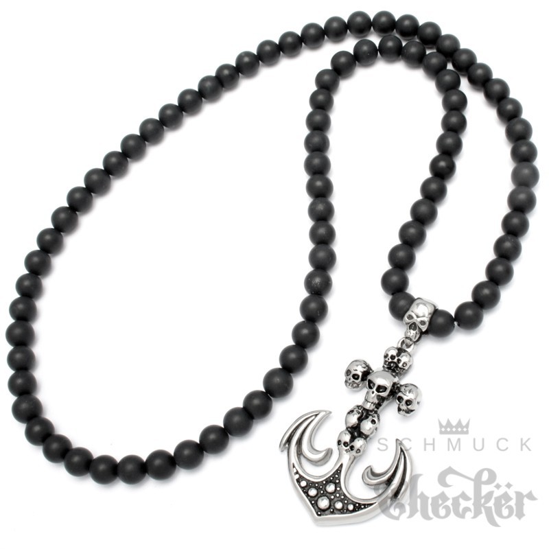 Onyx Perlen Halskette Anker Anhänger Totenköpfe Edelstahl schwarz matt Achat Beads