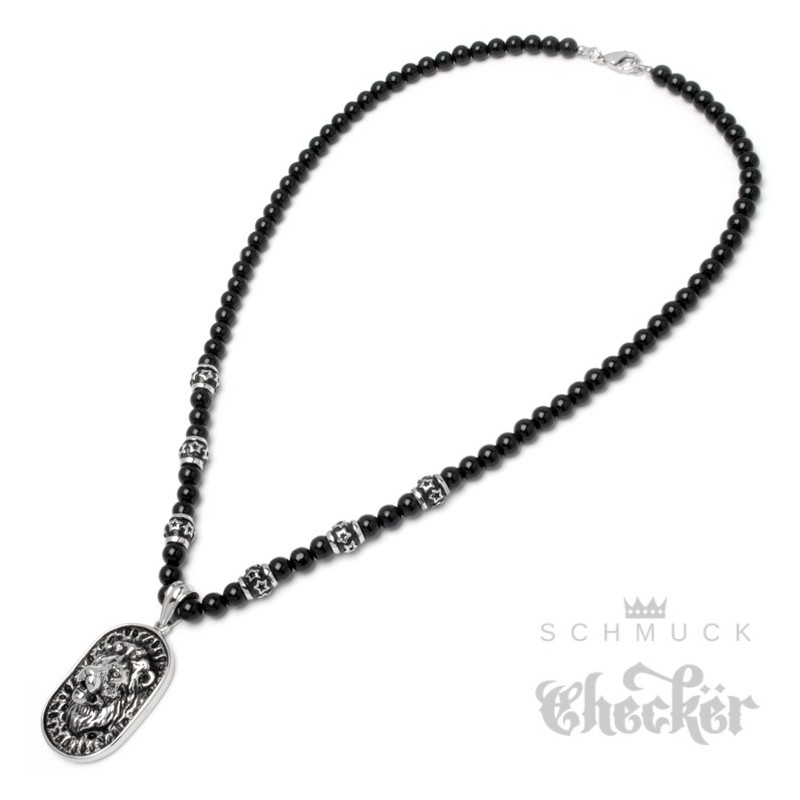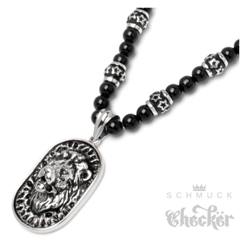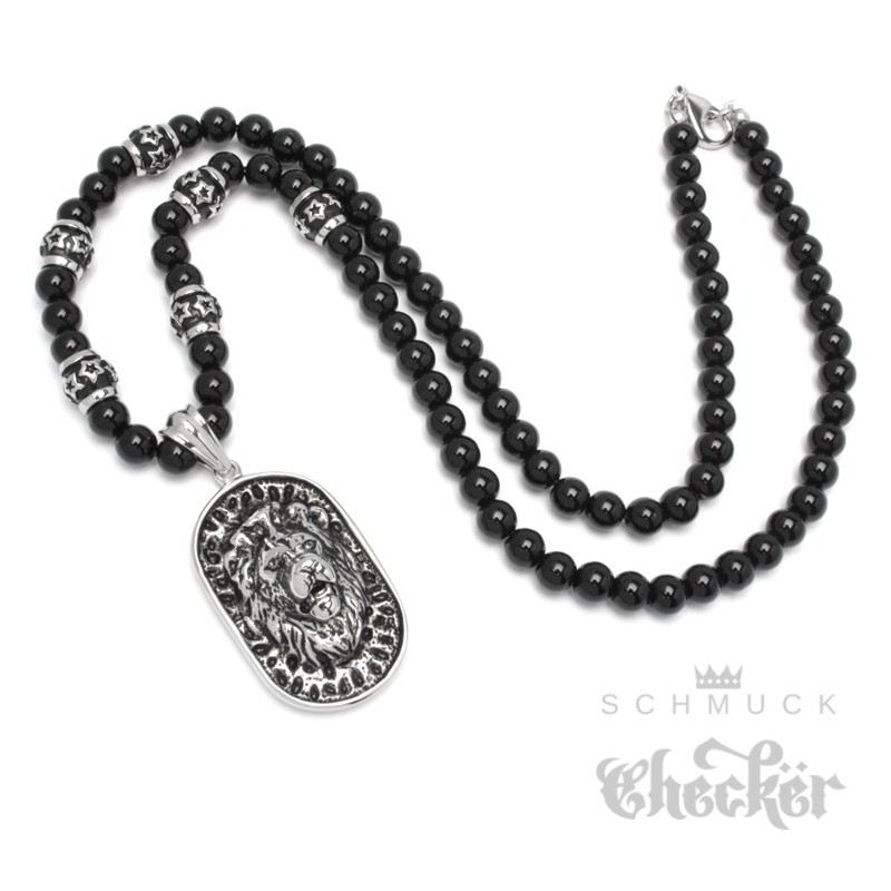 Onyx Perlen Halskette mit Löwe Anhänger aus Edelstahl schwarz Bead Mensbead Achat Kette