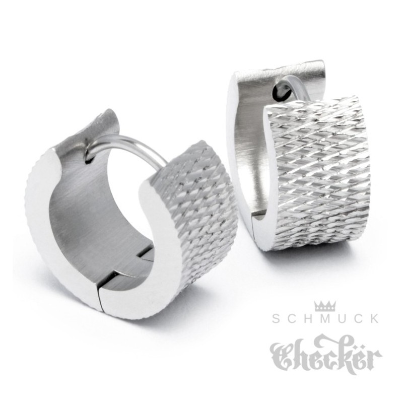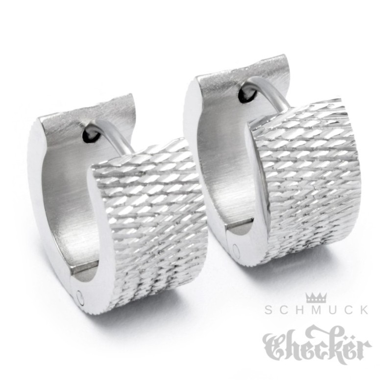 Edelstahl Herren Ohrringe breite Klapp-Creolen silver geriffelt glizernd 13mm Ø
