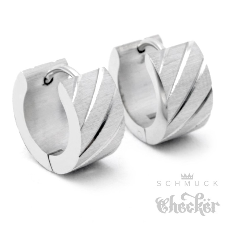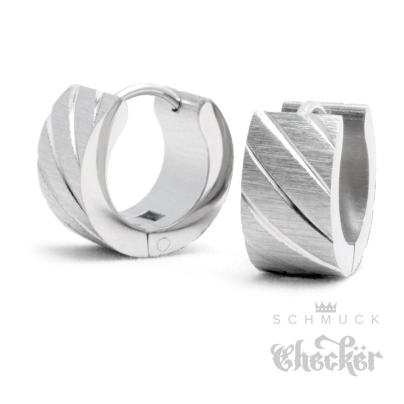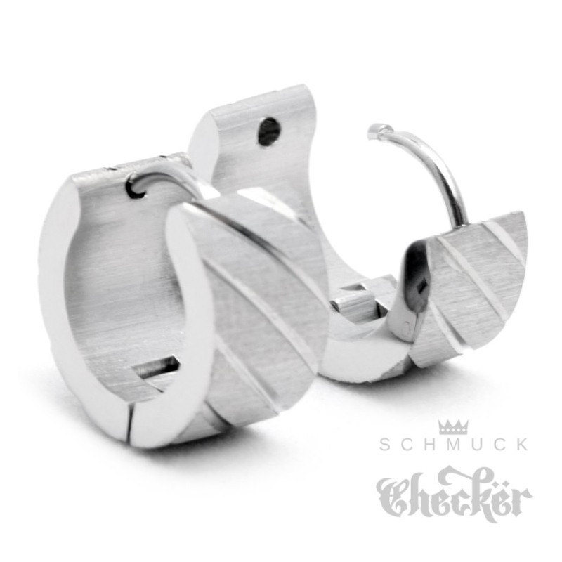 Edelstahl Herren Ohrringe Klapp-Creolen silber gebürstet matt Muster Linien 13mmØ