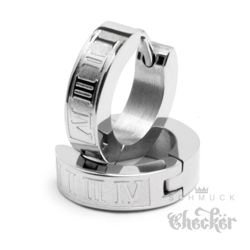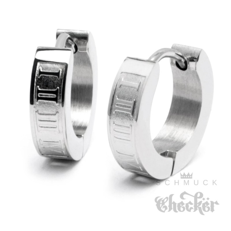 Schmale Herren Ohrringe mit römischen Zahlen aus Edelstahl Klapp-Creolen silber 13mm Ø