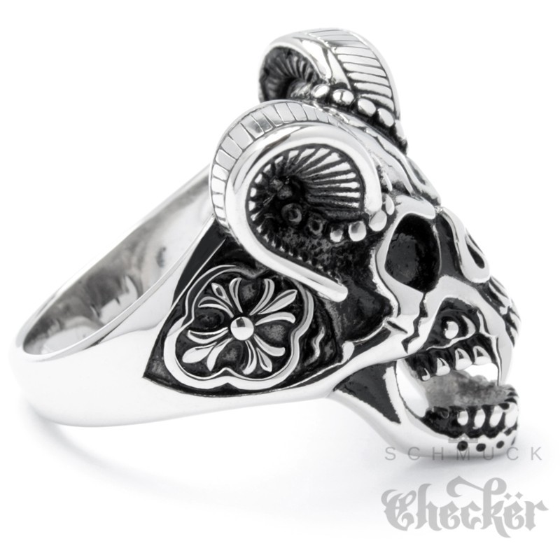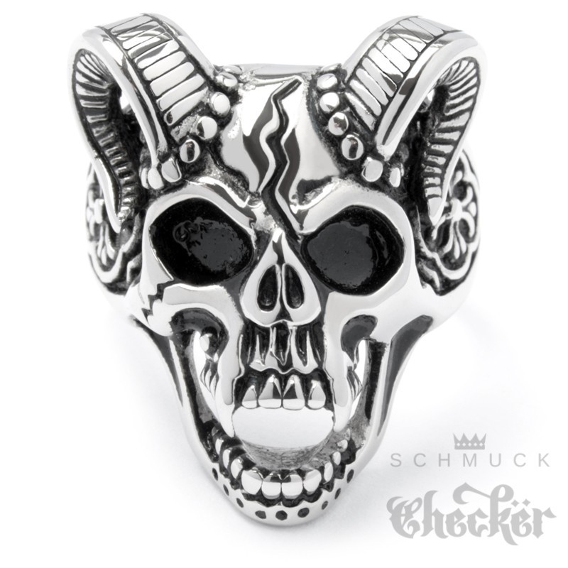 Devil Skull Ring aus Edelstahl Totenkopf mit Hörnern & Lilienkreuz Teufel Bikerring