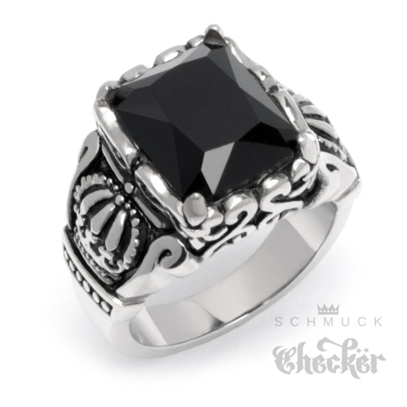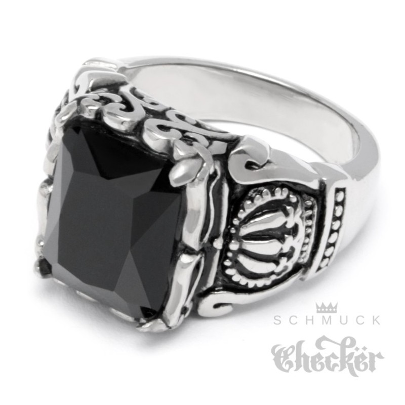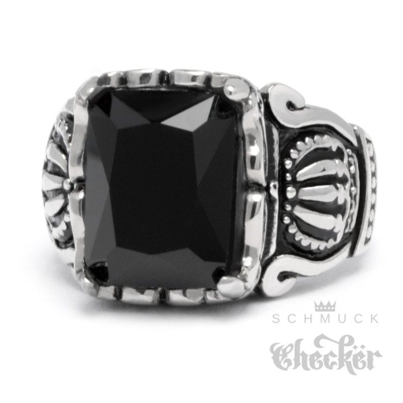 Edelstahl Herren Ring Onyx Stein Krone verziert silber schwarz Gothic Bikerring