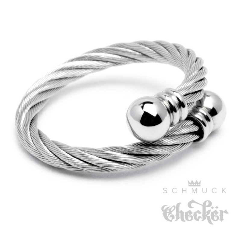 - Der Ring ist flexibel. Durch das Edelstahlseil passt er sich dem Finger seines Trägers an und geht beim Ablegen sofort wieder in seine Ursprungsform zurück.