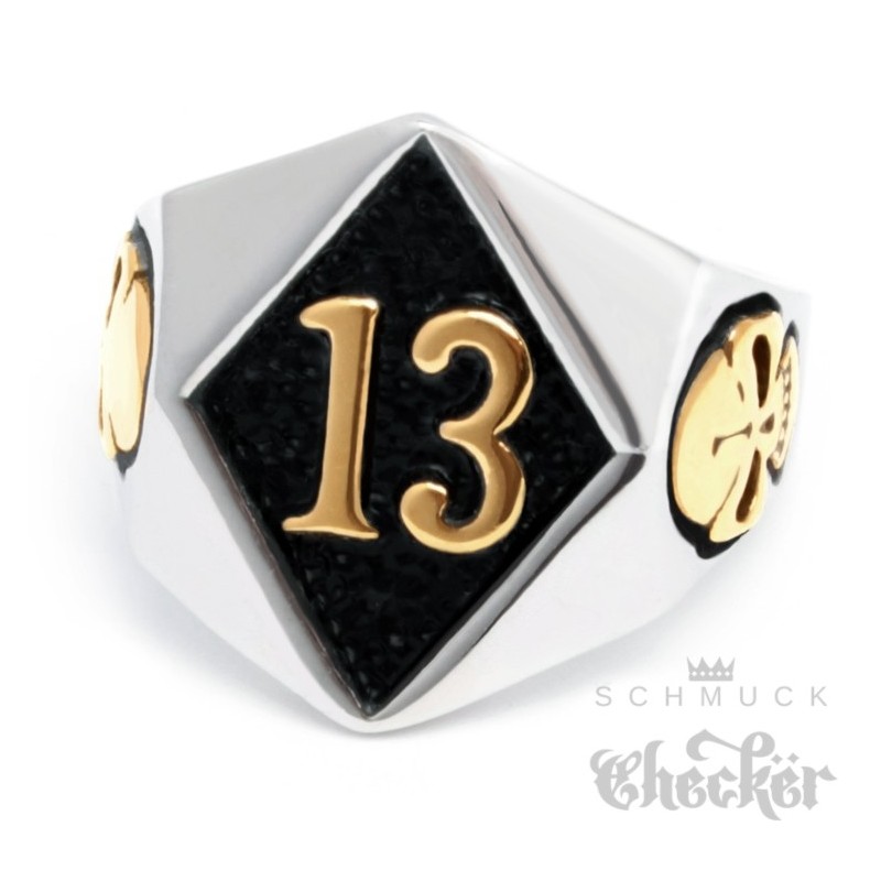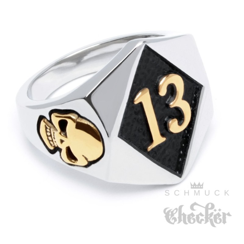 Bikerring mit Lucky 13 silber gold aus massivem Edelstahl Skull Biker Glücksbringer Ring