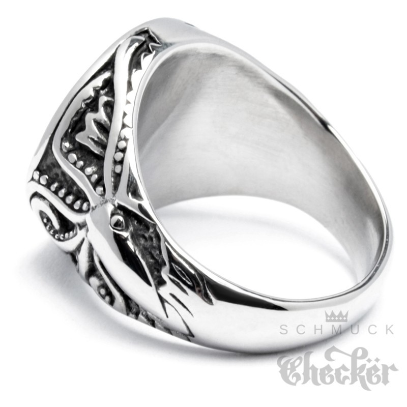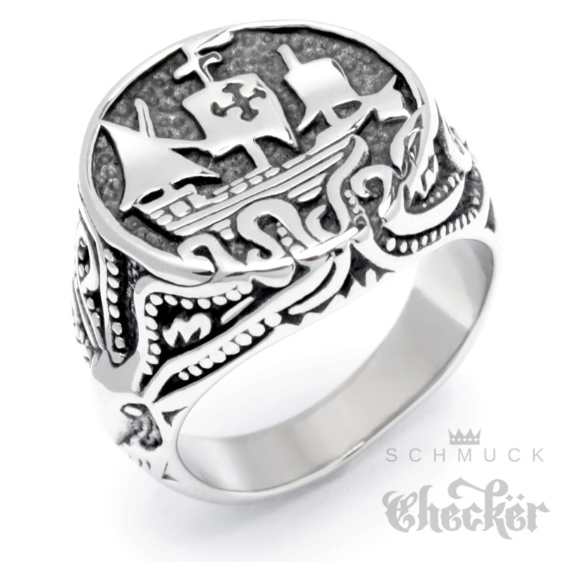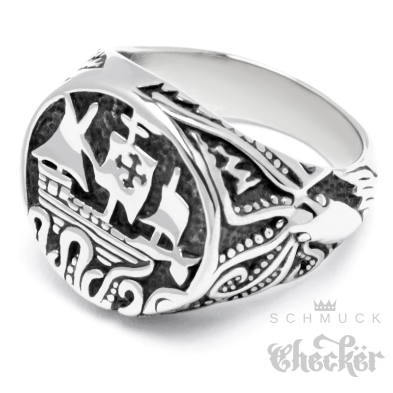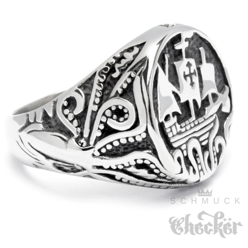 Richtig geiler Siegelring aus massivem Edelstahl. Dieser Ring zeigt ein Segelschiff das von zwei Riesenkraken angegriffen wird. Ein episches Motiv das auf diesem Herrenring verewigt wurde. Der Ring ist sehr detailliert verarbeitet, hat eine hochglanzpolierte Oberfläche und ist einfach nur schön anzusehen. Das perfekte Highlight für jede Männerhand.