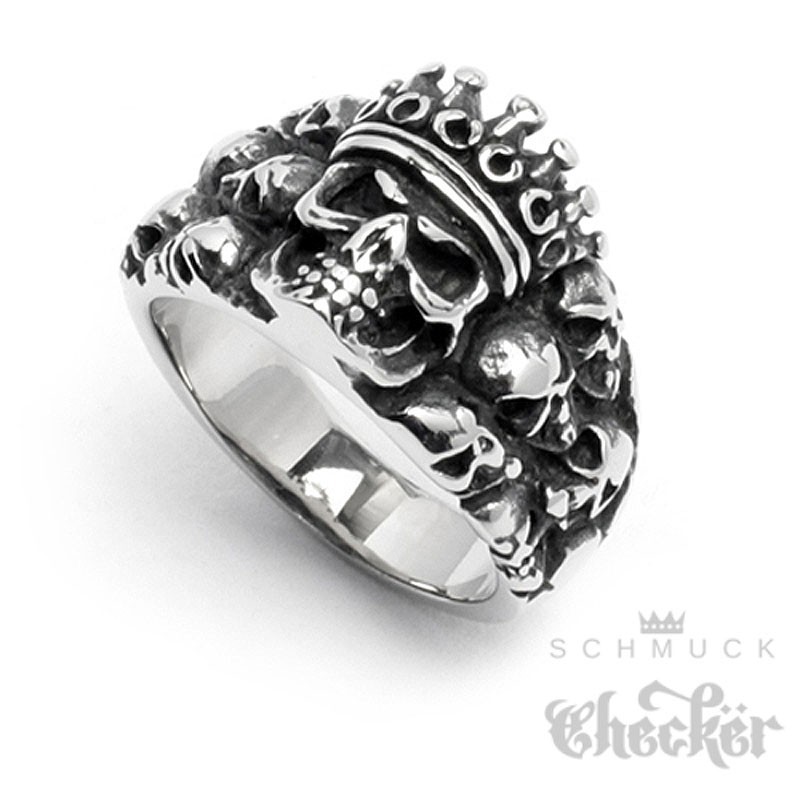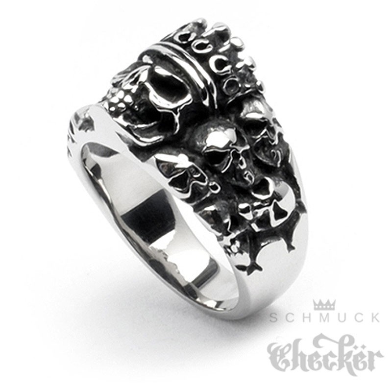 Dieser krasse Bikerring hat insgesamt 11 Schädel. Ein großer Totenkopf mit Krone umgeben von kleineren Totenköpfen. Dieser detaillierte King Skull ist aus massivem Edelstahl gefertigt. Er ist von seinen Ausmaßen nicht ganz so groß wie andere Totenkopfringe und damit auch gut für etwas kleinere Hände geeignet. Ein sehr cooler Ring für den King of the Road. Einfach Ringgröße aussuchen und bestellen.