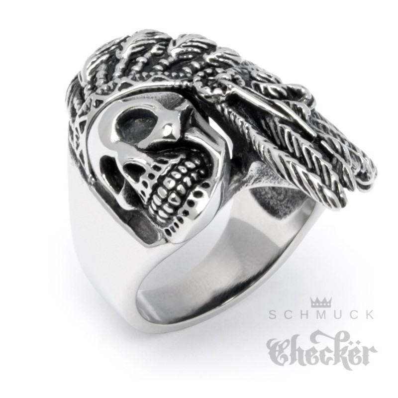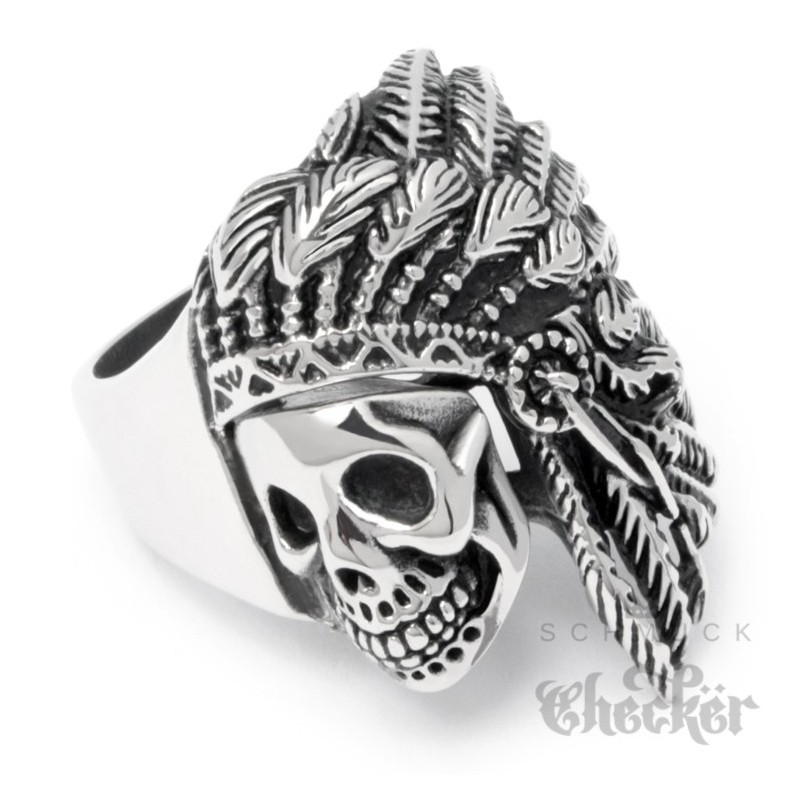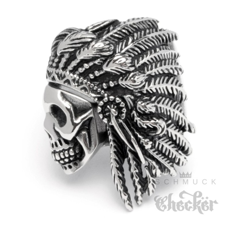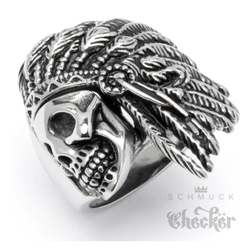 Edelstahl Ring Totenkopf mit Federschmuck Indianer Männer Geschenk Silber Bikerring