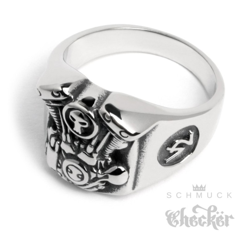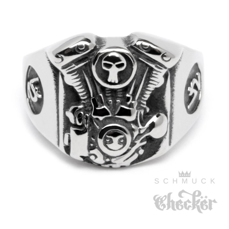 Edelstahl Ring V2 Motor Engine Totenkopf Skull detailliert silber Motorrad Biker