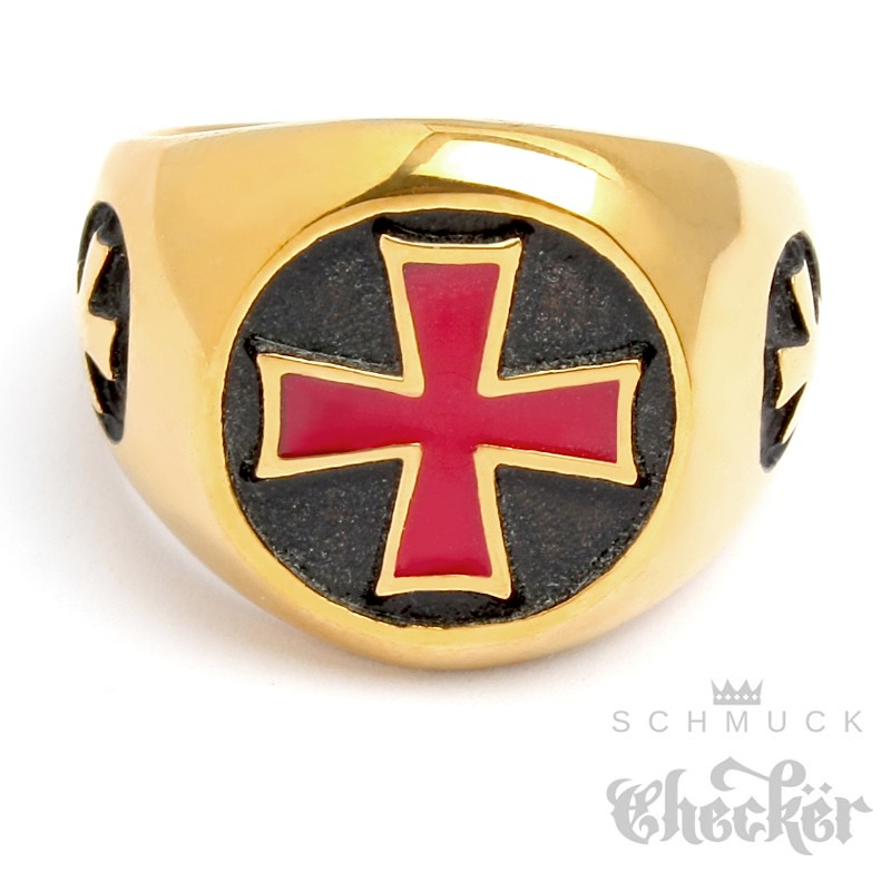 Goldener Templer-Ring mit rotem Tatzenkreuz Tempelritter Siegelring aus Edelstahl