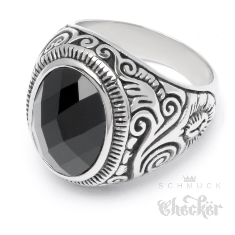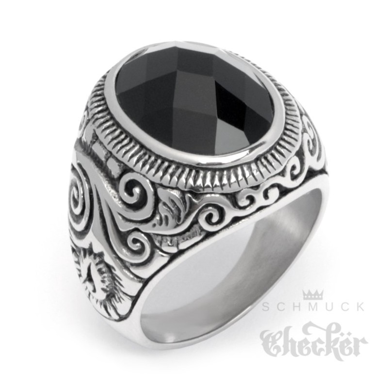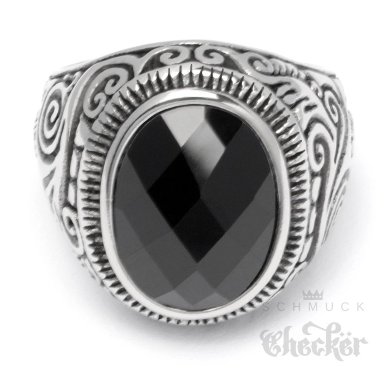 Großer Edelstahl Herren Ring Onyx Stein oval verziert muster silber schwarz