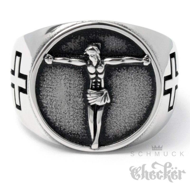 Jesus Ring mit 2 Kreuzen aus Edelstahl Christlicher Bikerring Kreuz silber massiv
