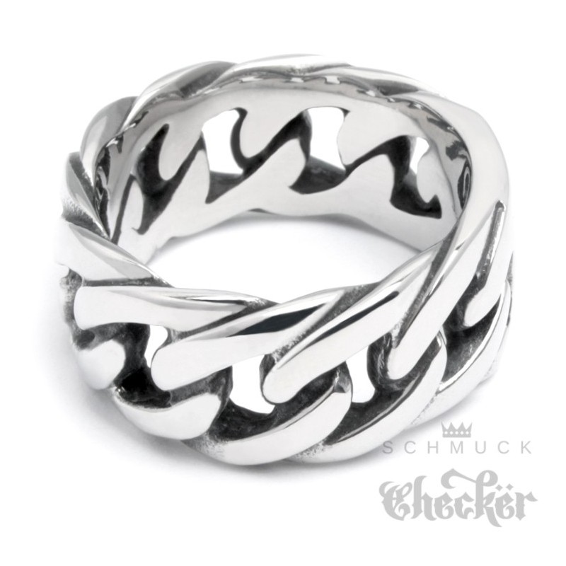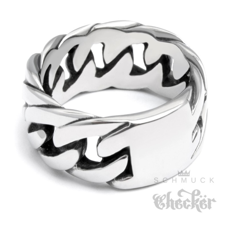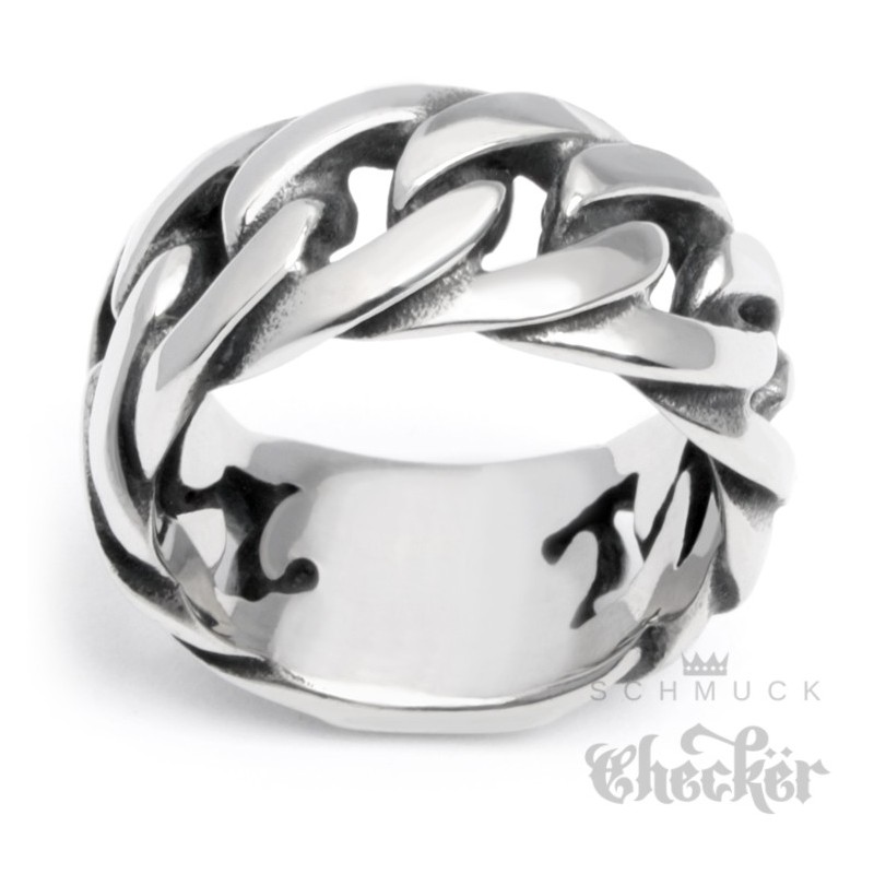 - Der Ring hat eine Panzerkettenoptik, ist aber aus einem Stück gefertigt und nicht aus einzelnen Gliedern wie eine Kette.