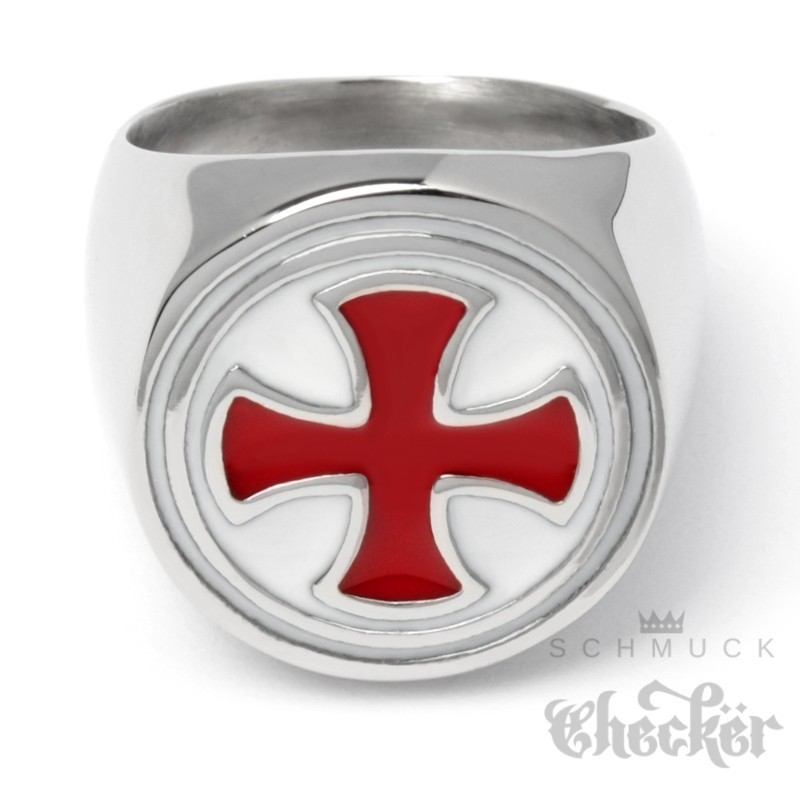 Schlichter Kreuzritter Ring aus Edelstahl mit rotem Tatzenkreuz Templer-Zeichen
