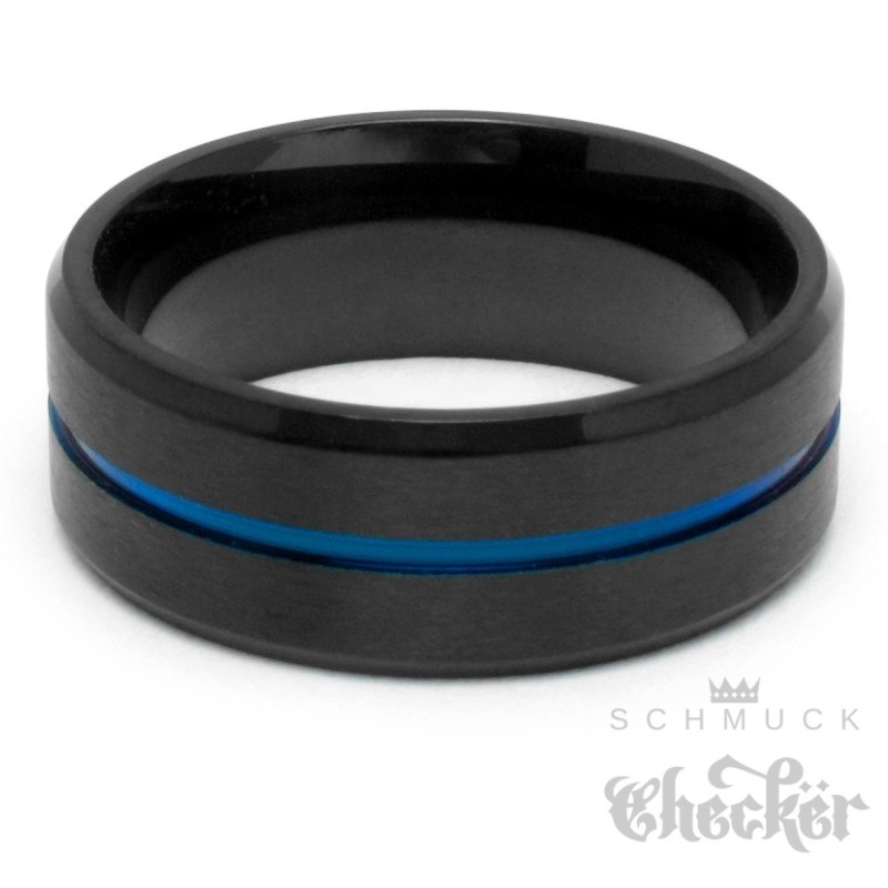 Schwarzer Männer-Ring mit blauem Streifen aus massivem Edelstahl Herren Geschenk
