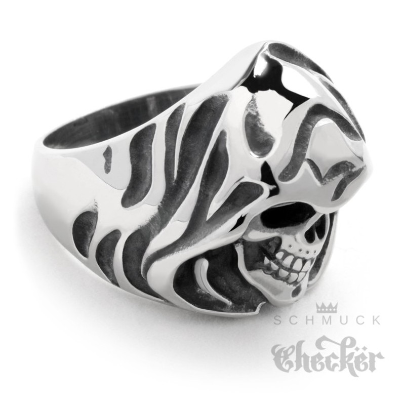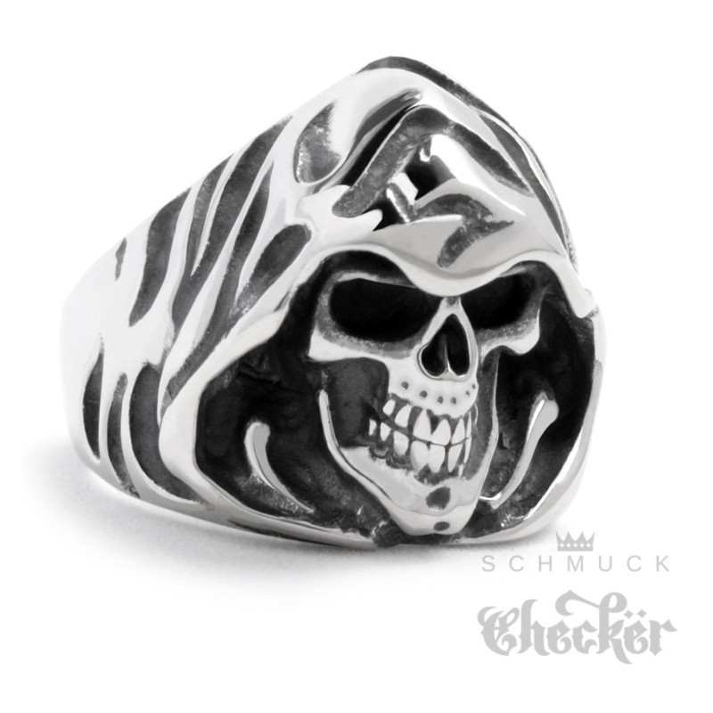 Bikerring mit Sensenmann Motiv. Der Ring stellt einen Totenkopf mit Kapuze dar und ist aus massivem Edelstahl gefertigt. Damit ist der Ring quasi unzerstörbar und der perfekte Schmuck für Biker und Rocker. Der Totenkopfring ist silber mit polierter Oberfläche. Damit alle Details auch richtig zur Geltung kommen wurde er teilweise geschwärzt. Diesen hochwertigen Ring mit Skull kannst Du hier kaufen.