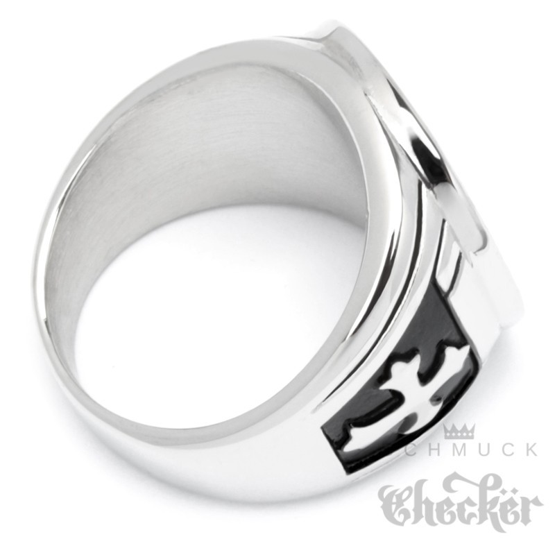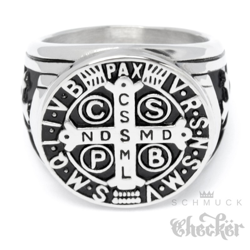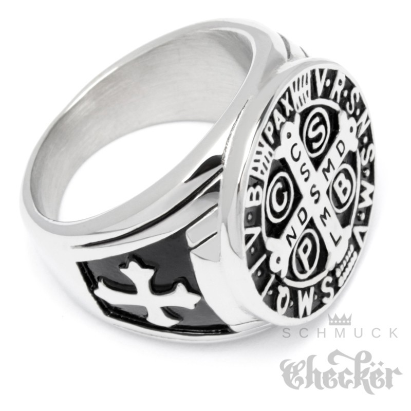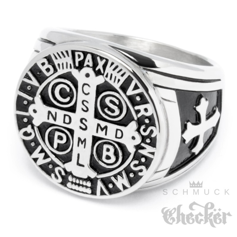 Siegelring mit Benediktus-Kreuz aus massivem Edelstahl Schutzamulett Bikerring