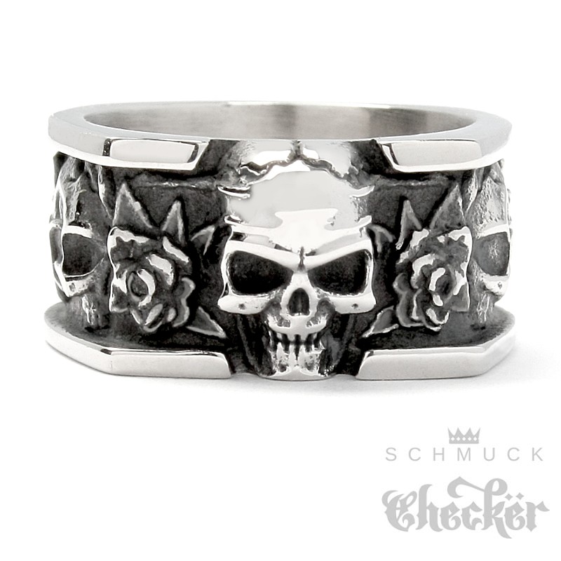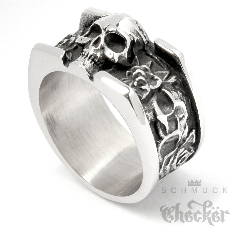 Totenkopf Ring mit Rosen aus massivem Edelstahl silber massiver Bikerschmuck