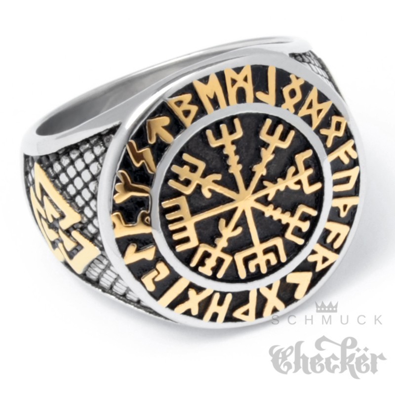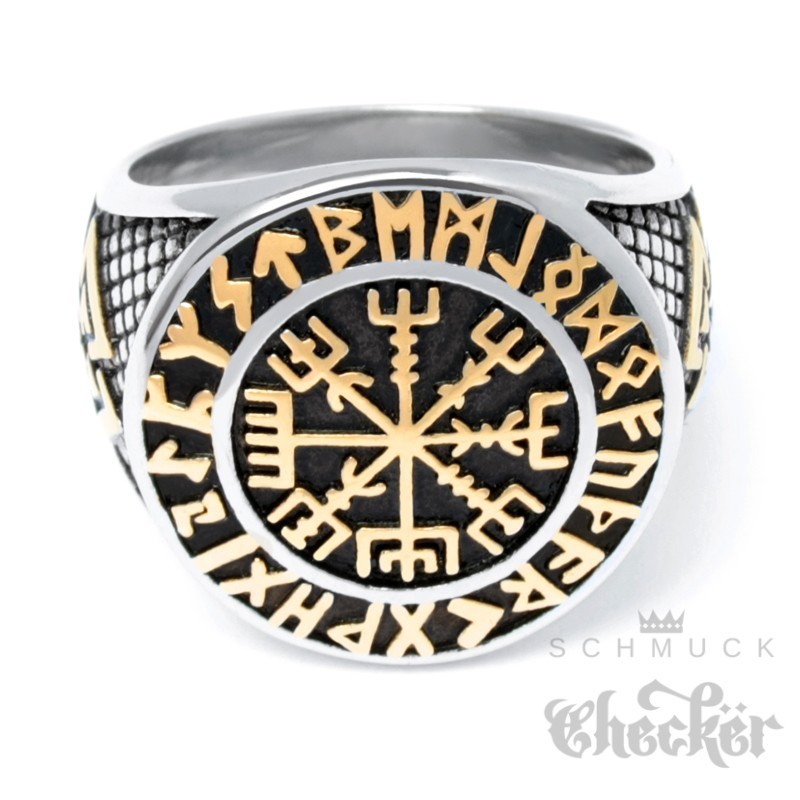 Wikinger-Ring mit Vegvisir, Valknut und Schutzrunen silber & gold aus Edelstahl