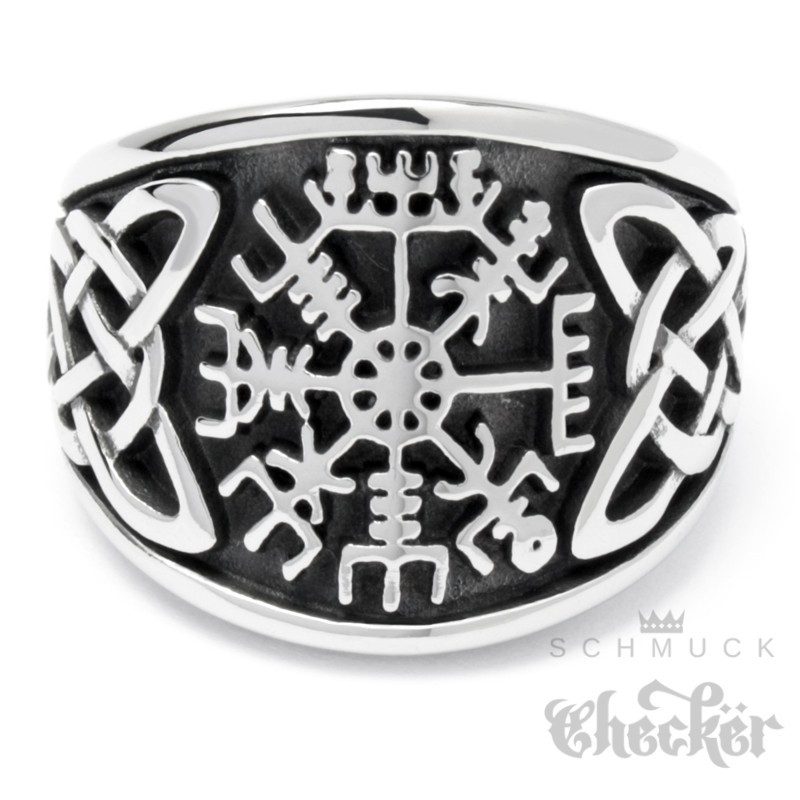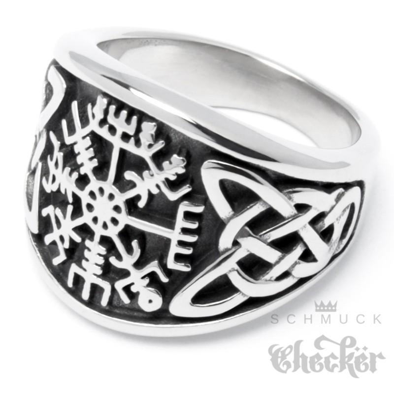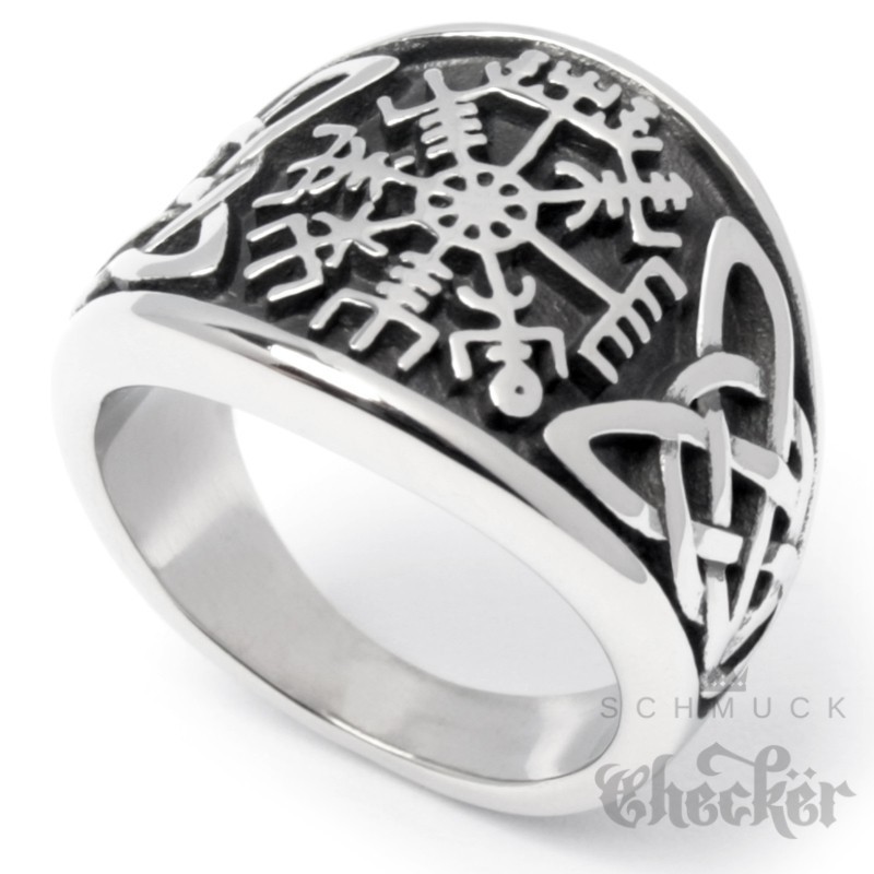Wikingerring mit Runen-Kompass Vegvisir nordischer Ring Edelstahl silber hochwertig