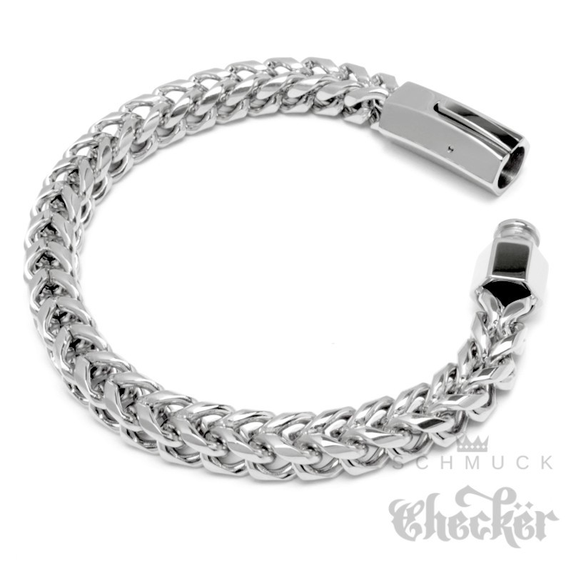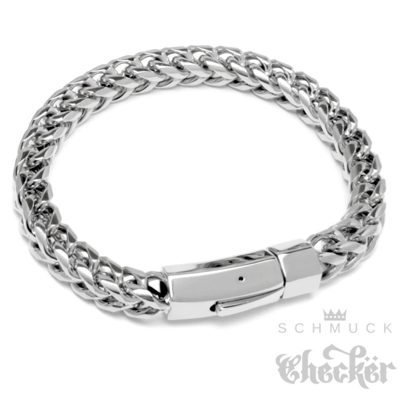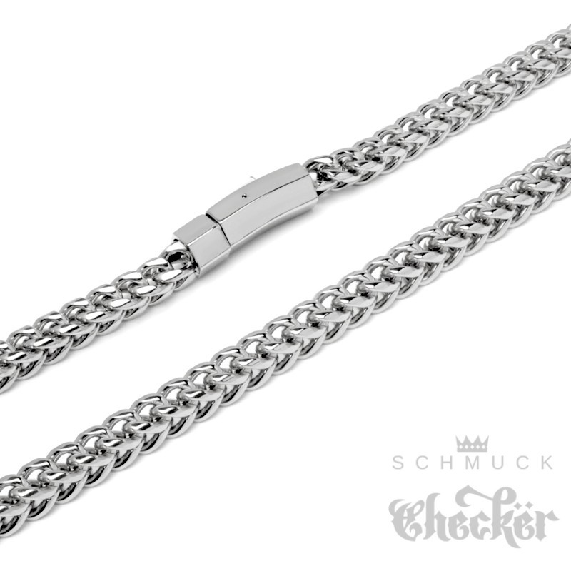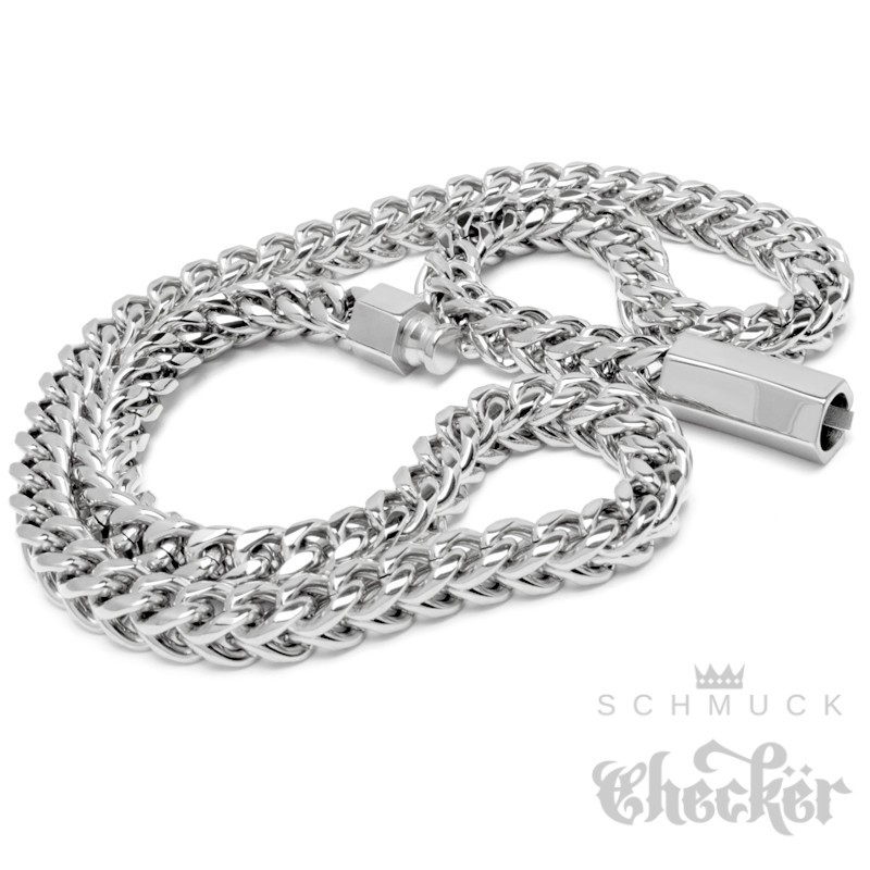 - Halskette und Armband bestehen aus zwei aneinandergeschweißten Panzerketten. Daraus entsteht eine einmalige, interessante und massive Kettenform - die sogenannte Fuchsschwanzkette.